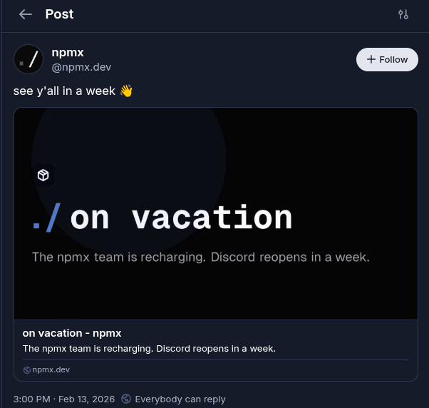 El equipo de npmx, responsable del navegador de registros para Node.js, anunció algo verdaderamente escandaloso en Bluesky. Decidieron tomarse una semana libre para descansar. ¡Qué atrevimiento!